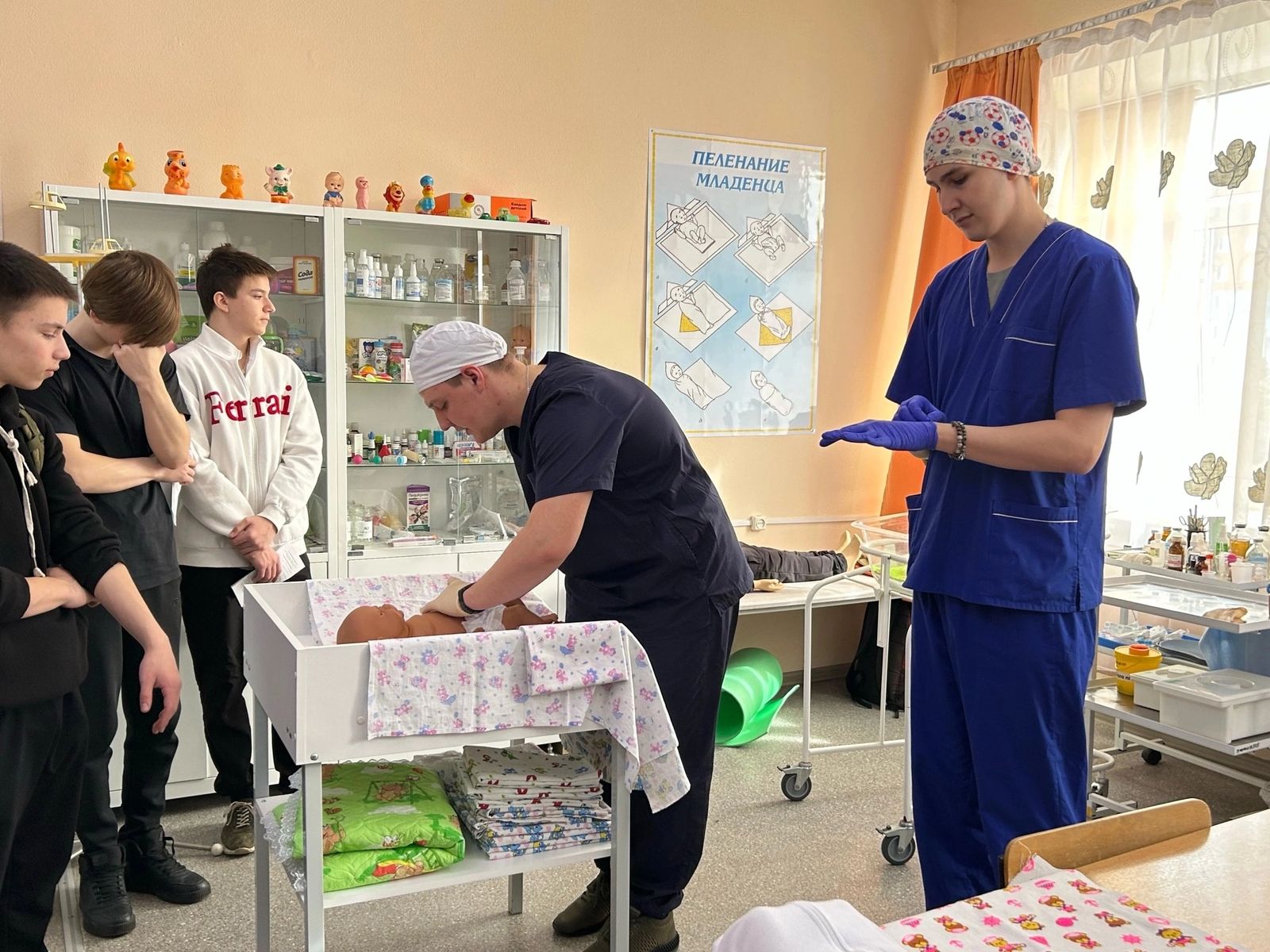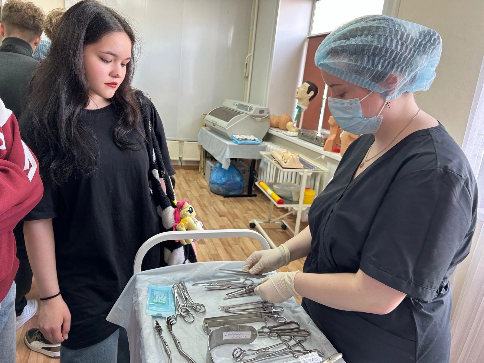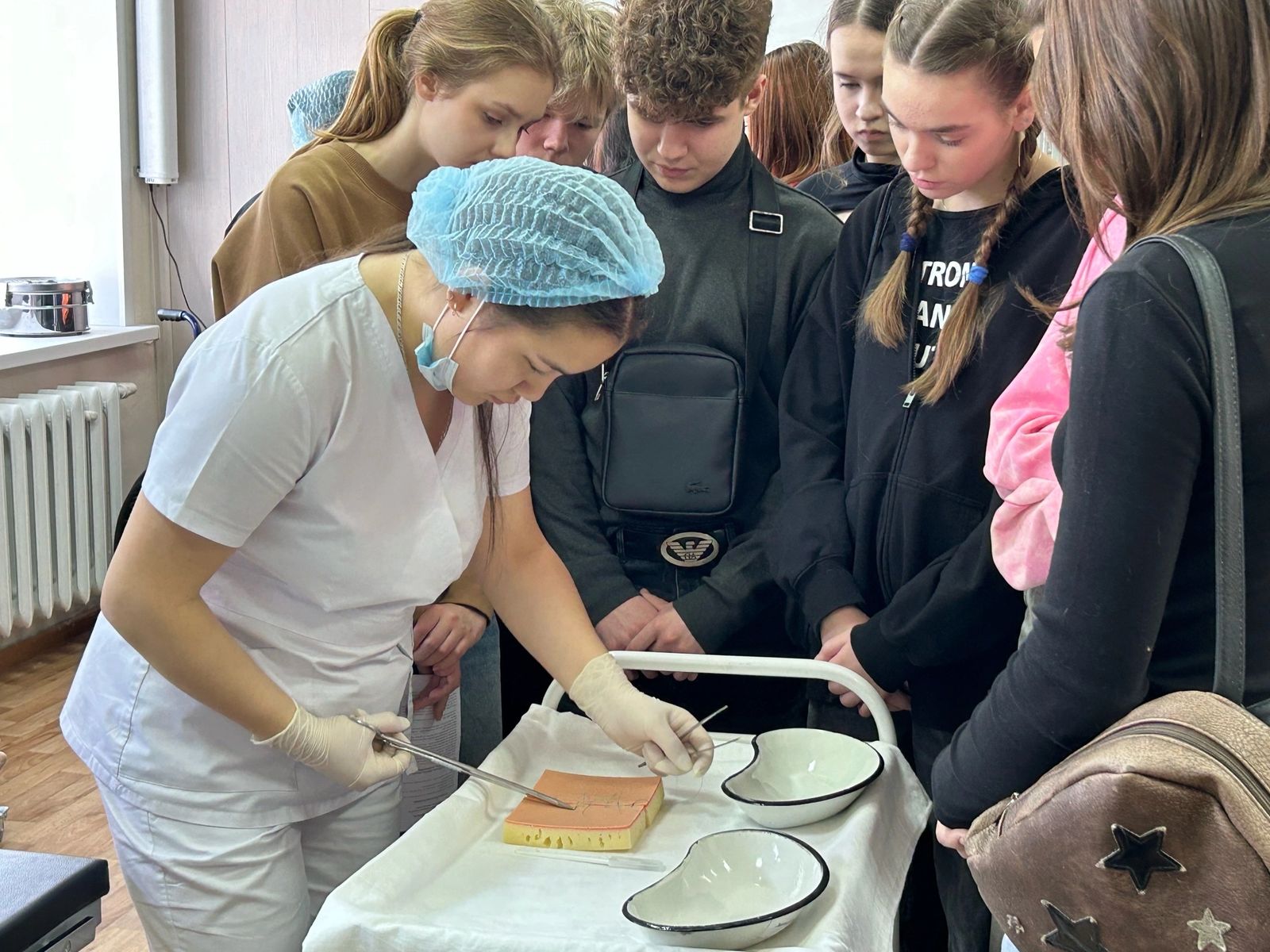 После официальной части, сопровождаемые волонтерами, абитуриенты прошли на мастер-классы по постановке внутримышечных инъекций, десмургии, измерения давления, демонстрацией менингеальных симптомов и симптомов натяжения, пеленания новорожденного, уходу за больными, по определению функциональных проб, посетили кабинеты анатомии, химии, электронный тир, получили «Ликбез в кабинете хирургии и реанимации».