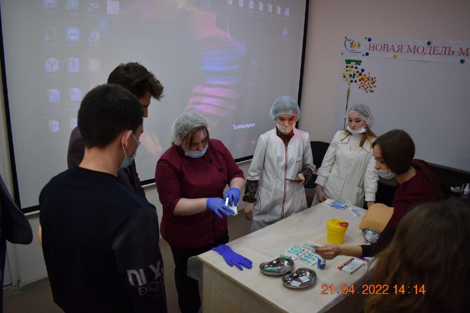 Студенты медицинского колледжа продемонстрировали гостям технику постановки внутримышечных инъекций.