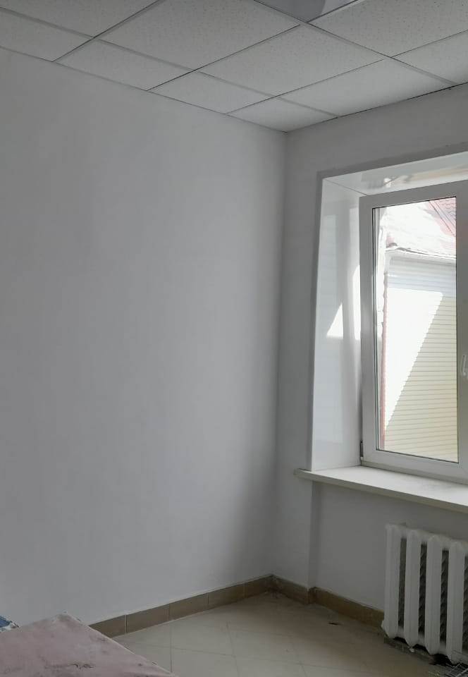Завершены общестроительные работы в отделении терапии: выполняются штукатурные и плиточные работы, производится устройство напольного покрытия (плитка, линолеум), монтаж подвесного потолка и установка сантехнического и электрооборудования, произведена замена дверных блоков.