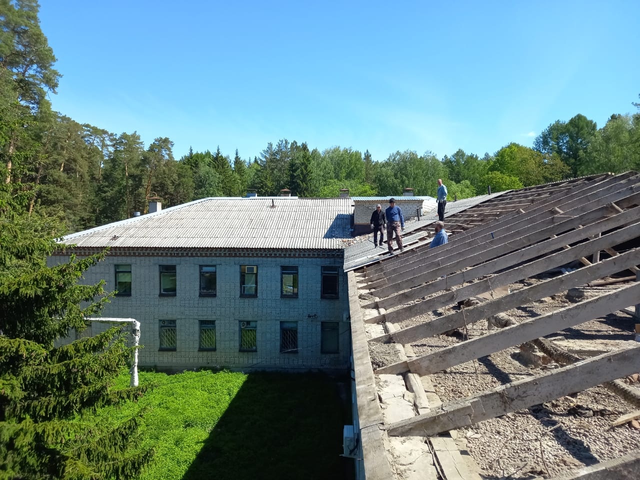 В настоящее время работники подрядной организации приступили к разборке старого кровельного покрытия (шифера), разборке устаревших стропил и обрешетки. Параллельно ведется монтаж новых элементов конструкции. Контракт на выполнение работ по капитальному ремонту кровли заключен с ООО «Строй-Гарант+» на сумму более 8 млн рублей.