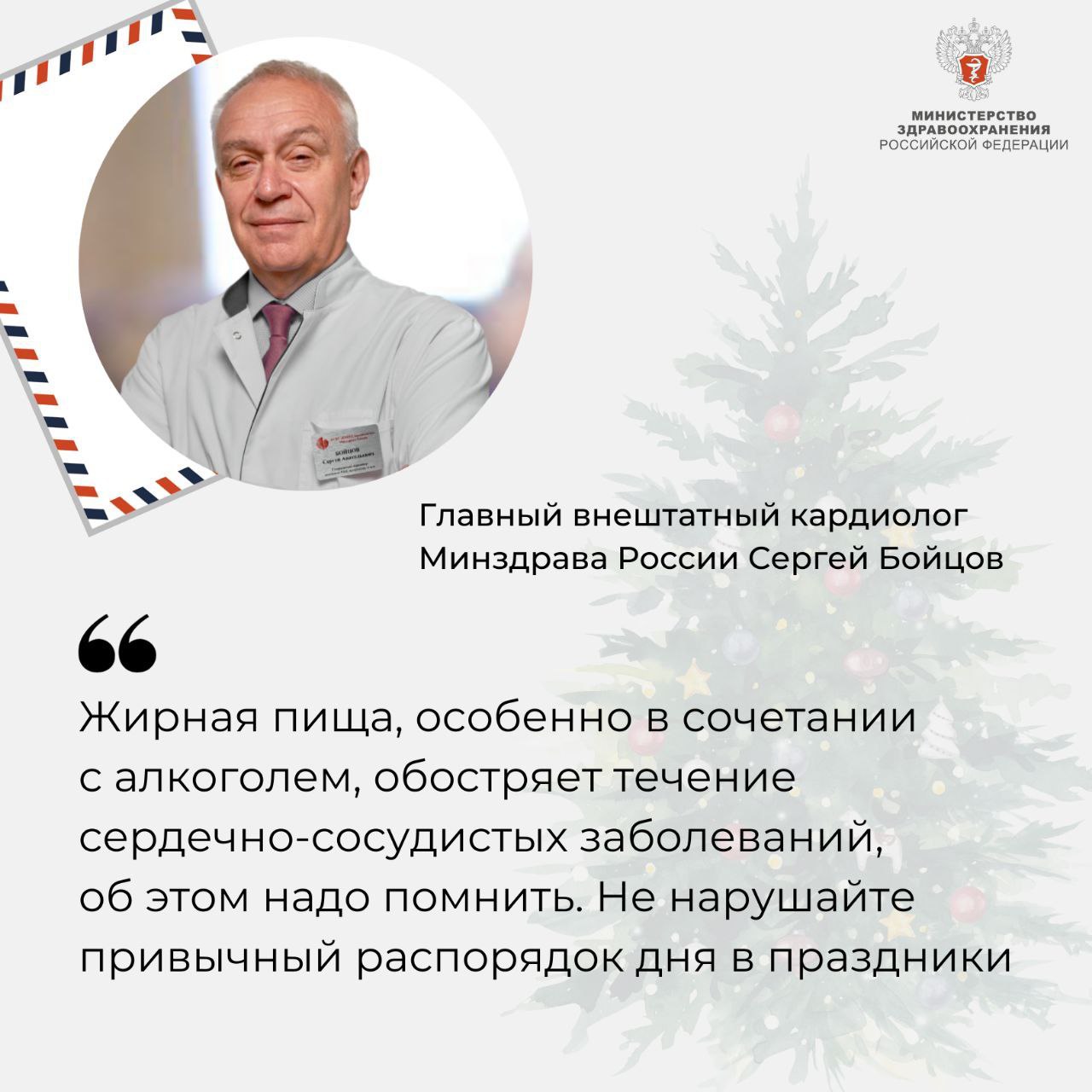 МинздравНапоминает: Соблюдайте умеренность в еде. Особенно людям с сердечно-сосудистыми заболеваниями важно не нарушать привычный распорядок дня в новогодние праздники.