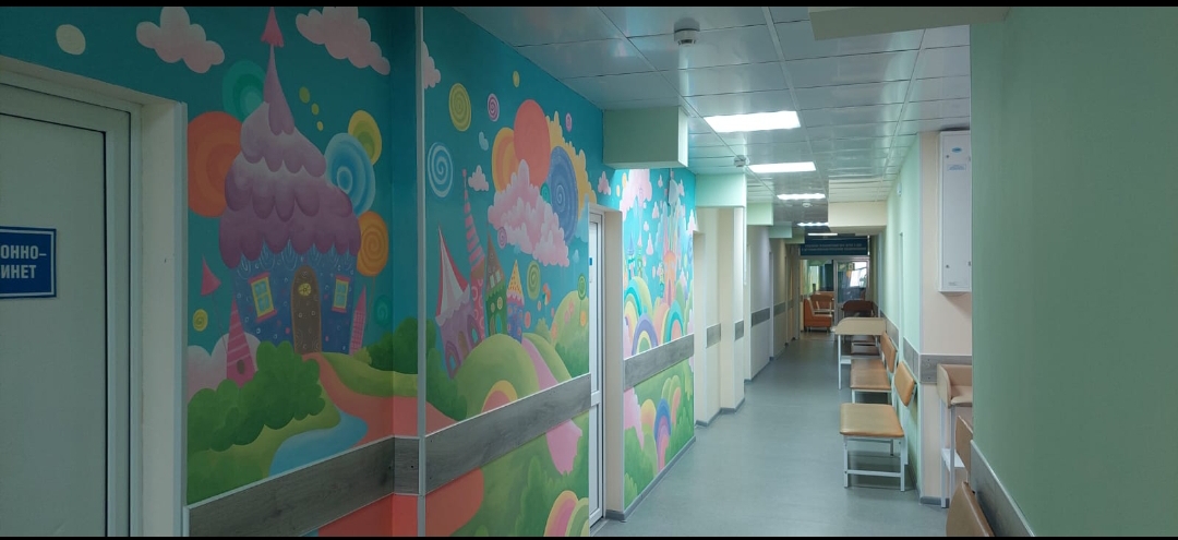 «В настоящее время к оформлению стен уже приступил художник. Стены оформлены рисованными мультяшными картинами — на радость малышам. Оформление соответствует детскому восприятию. Всё обустроено для комфорта маленьких пациентов», – комментирует руководитель Курганской детской поликлиники Лидия Смолькова.