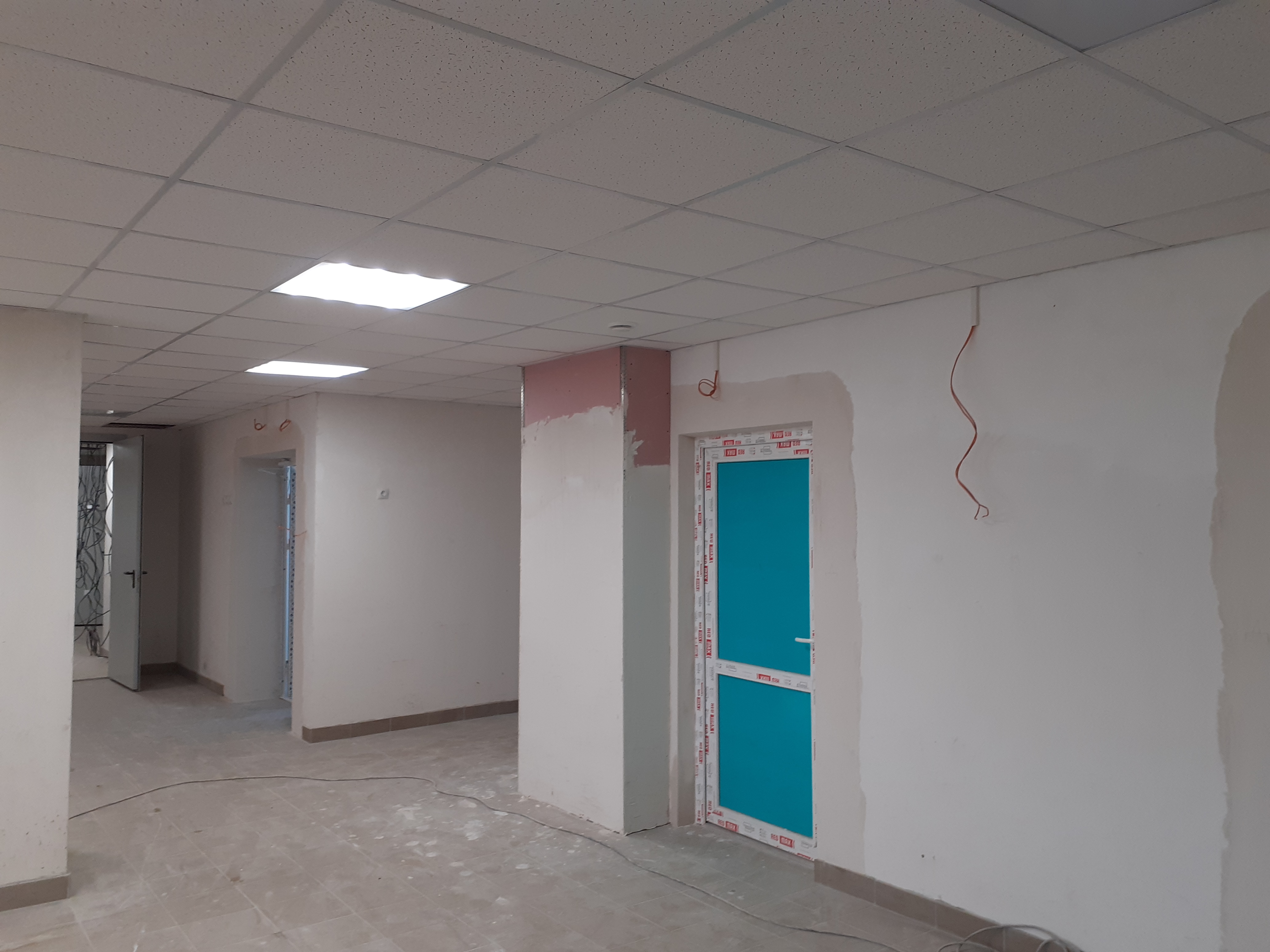 В здании идет покраска потолков и стен, производится монтаж подвесного потолка «Армстронг» и светодиодных светильников. Также проходит укладка напольной плитки и установка перил на лестничных маршах.