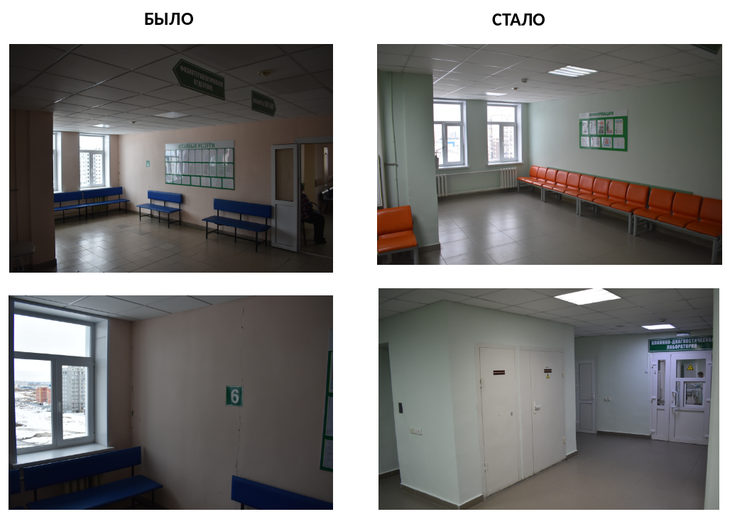 «Проведена замена напольной плитки на керамогранит, дверных блоков на алюминиевые, подвесного потолка, выполнен ремонт штукатурки стен и их покраска, отремонтированы санузлы, проведен монтаж современной пожарной сигнализации. В целом на выполнение ремонтных работ было выделено 10,1 млн рублей. В настоящее время ожидается поставка мягких диванов, кулеров и информационных панелей, которые будут размещены в холлах на этажах», комментирует главный врач Курганской поликлиники №1 Владимир Безлер.