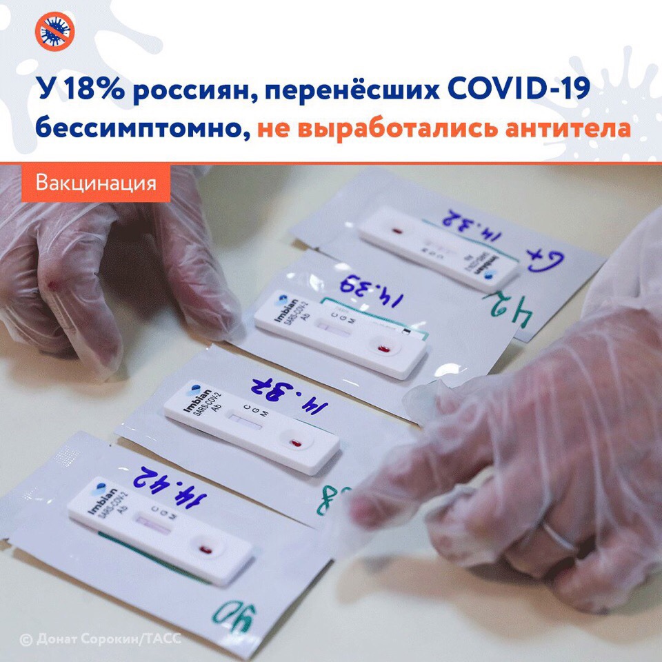Роспотребнадзор провёл пилотное исследование в 26 регионах России, которое показало, что у 18% перенёсших бессимптомную коронавирусную инфекцию, подтверждённую ПЦР-тестом, не выработались антитела к вирусу. Эти люди были выявлены как контактные с заболевшими.