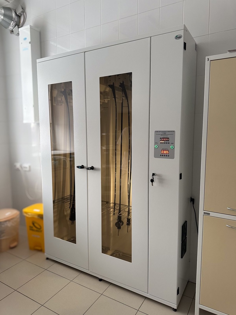 Так, в эндоскопическое отделение Курганской областной больницы № 2 введен в эксплуатацию современный шкаф, предназначенный для хранения стерильных эндоскопов с обеззараженным потоком воздуха.